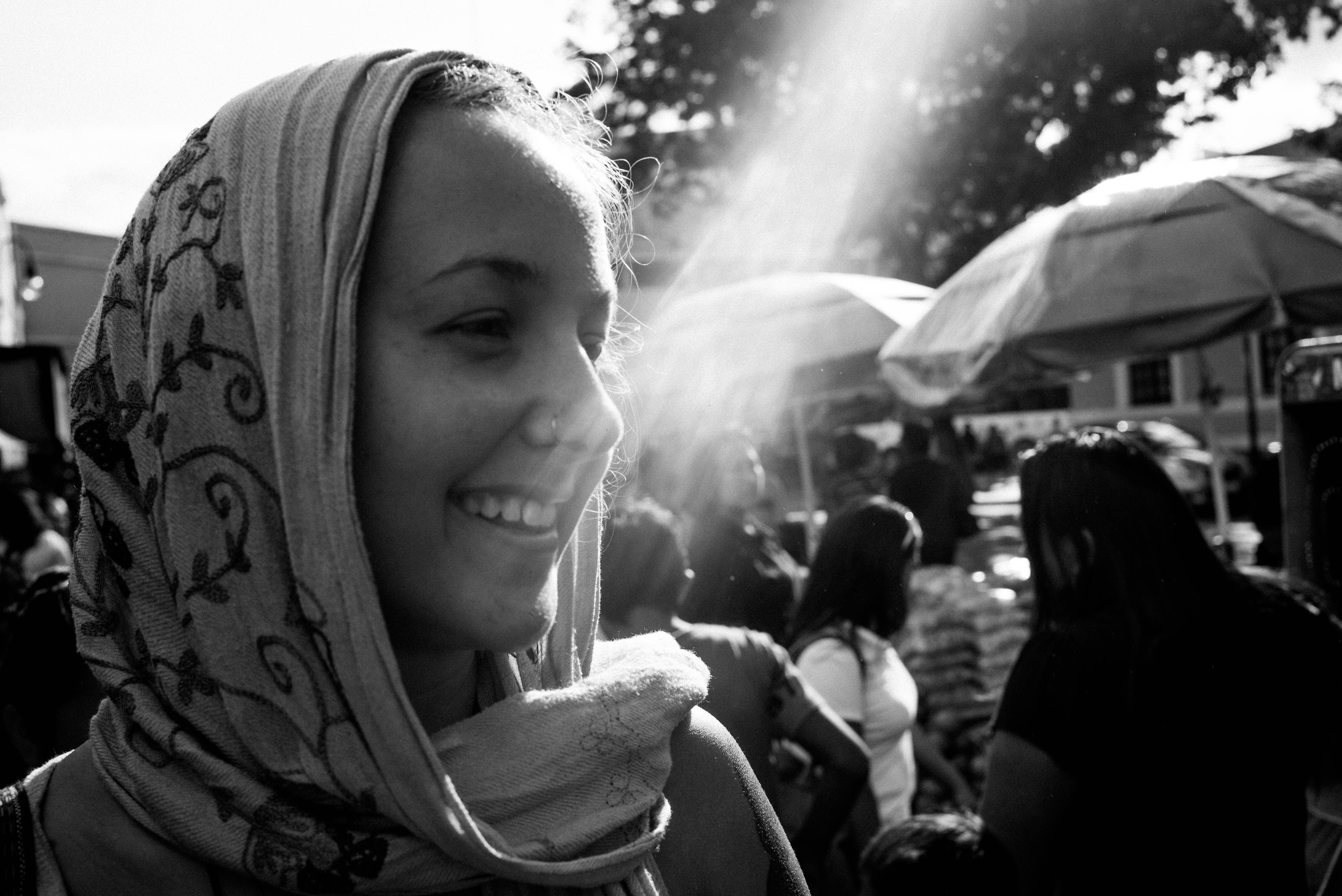 In a vibrant outdoor market, a young woman with a scarf smiles broadly, her joy captured in a moment of serene clarity. The play of light filters through the bustling crowd, illuminating her face and enhancing the cheerful ambiance with stark contrasts of black and white. The soft focus on the background highlights her warmth against the lively chaos surrounding her.