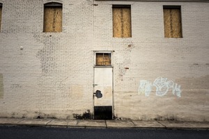 This photograph captures the starkness of an abandoned brick wall, dominated by a weathered door and boarded-up windows. The muted tones and subtle graffiti evoke a sense of neglect and desolation, highlighting the passage of time. Soft, diffused natural light enhances the mood, casting a quiet melancholy over the scene.
