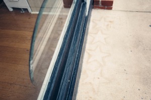 This photograph captures the gentle interplay of light and shadow as a glass window reflects a serene indoor space while framing an outdoor scene. The subtle texture of the creamy sidewalk, marked with faint star impressions, adds a whimsical touch to the composition. The muted colors evoke a sense of calmness, creating a contemplative mood that invites viewers to pause and reflect.