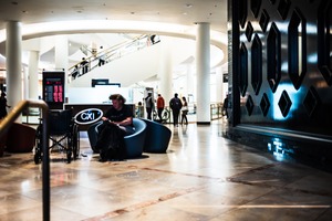 In a modern, spacious lobby, a solitary figure occupies a vibrant blue chair, immersed in their phone while surrounded by the bustling activity of others in the background. Soft, diffused lighting casts a serene glow across the scene, contrasting with the sleek, dark wall beside him. The composition invites a feeling of quiet contemplation amidst the chaos of urban life.