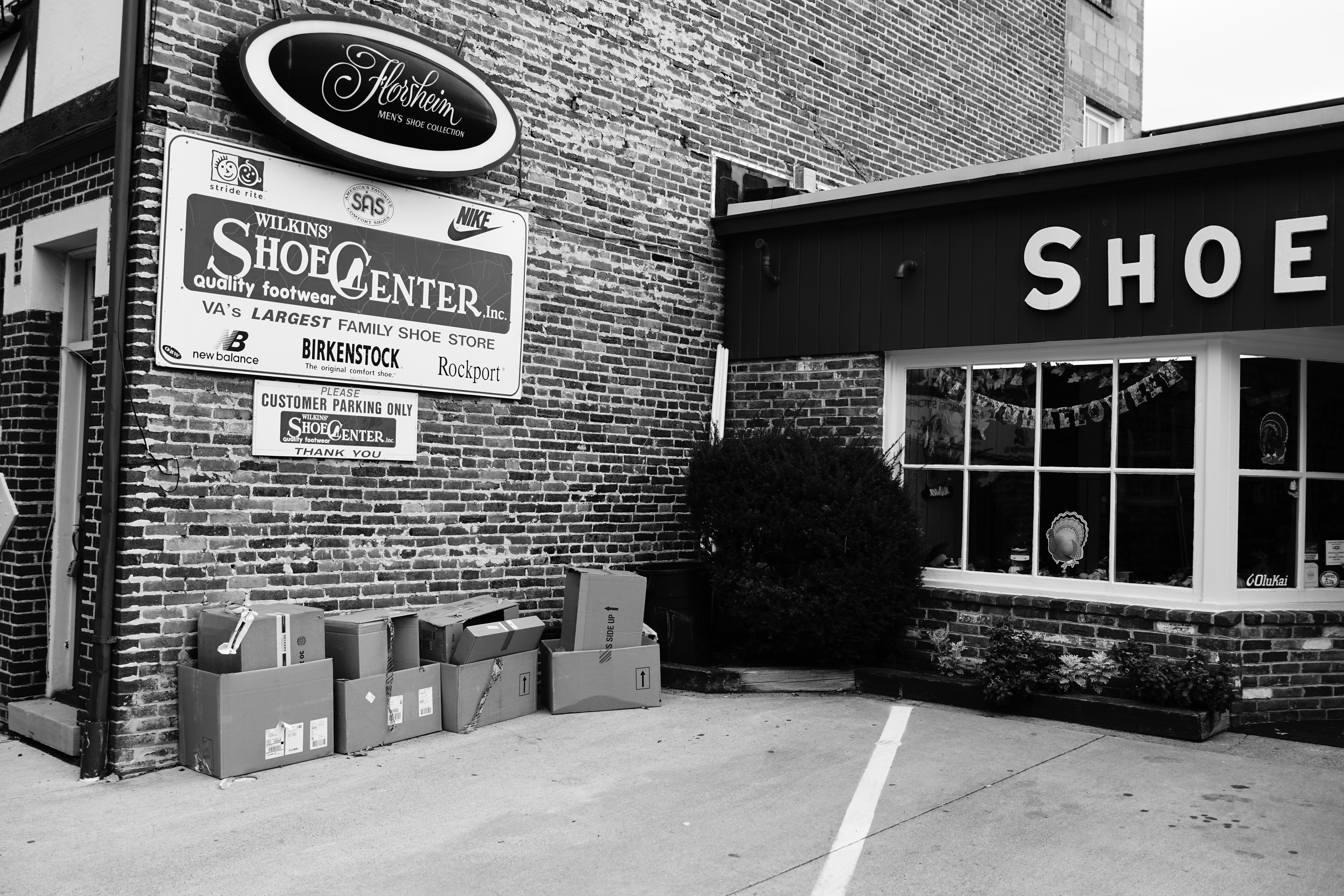 In this black and white photograph, the textured brick wall serves as a backdrop to the inviting storefront of a shoe center. The mood is nostalgic and urban, highlighted by the scattered cardboard boxes that hint at a busy day. Soft, diffuse lighting softly illuminates the scene, enhancing the feeling of a quiet moment in a bustling neighborhood.