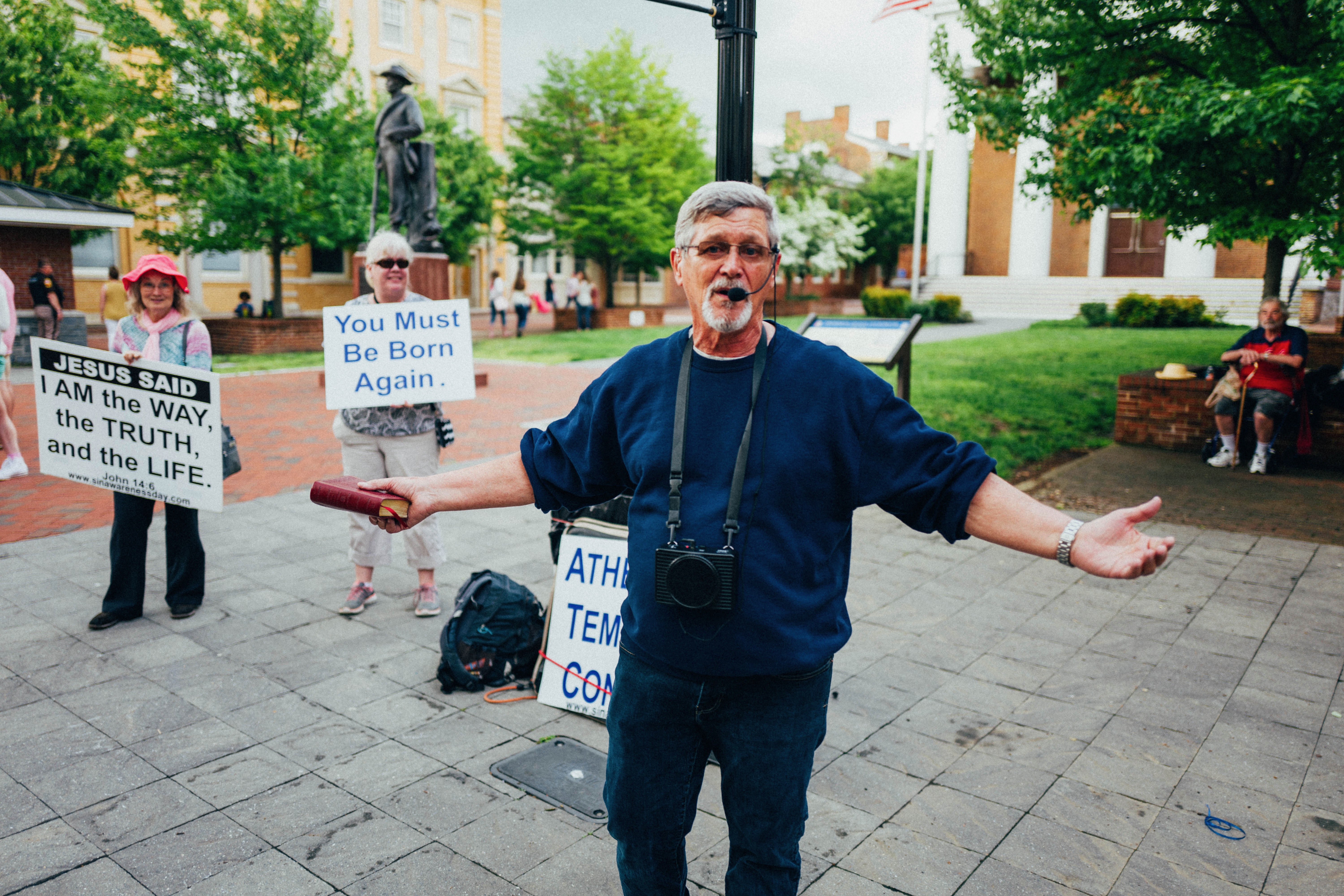 A vibrant scene unfolds in a public square, where a passionate speaker gestures animatedly while holding a microphone. Surrounding him, supporters showcase signs that convey messages of faith, contrasted by a relaxed atmosphere punctuated by casual observers and green foliage. The soft, diffused lighting highlights the earnest expressions, enhancing the mood of spirited dialogue and community engagement.