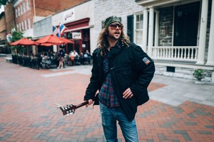 A laid-back musician stands confidently in a bustling street, guitar in hand, exuding a sense of freedom and artistic spirit. The soft, diffused lighting highlights his relaxed demeanor, while vibrant colors from nearby café umbrellas add warmth to the urban setting. His casual outfit and the textured pavement create an inviting atmosphere, suggesting a moment of connection in a lively town square.