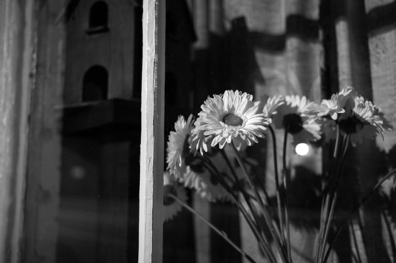 In this black and white photograph, delicate daisies emerge softly from the shadows, their blossoms illuminated by gentle light. The muted tones create a tranquil atmosphere, with the dark silhouette of a rustic birdhouse in the background adding depth. A sheer curtain softly diffuses the light, enhancing the intimate mood of this serene scene.