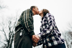 In this intimate capture, a couple shares a tender kiss, their hands clasped together in a loving gesture. The low angle emphasizes their closeness against a muted, overcast sky, enhancing the emotional intensity of the moment. Their matching plaid shirts add to the cozy atmosphere, suggesting warmth and connection amidst the cool surroundings.