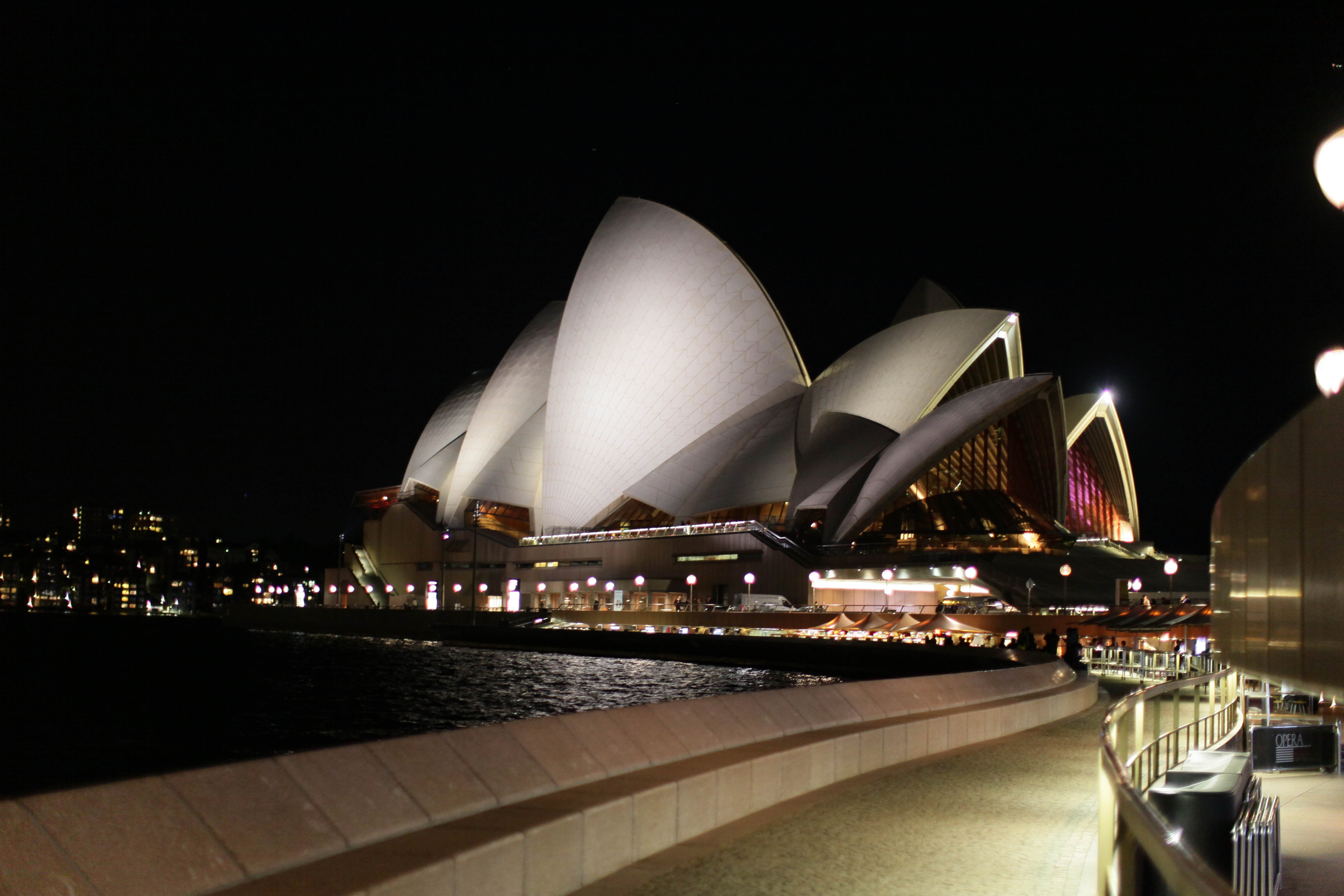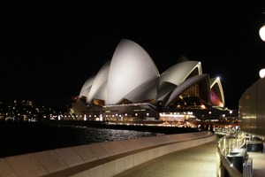 The iconic Sydney Opera House stands majestically against the dark night sky, its sails illuminated by soft lighting that accentuates their elegant curves. The tranquil waters reflect the vibrant hues of the nearby city lights, creating a serene yet lively atmosphere. The composition draws the eye along the waterfront promenade, inviting viewers to explore this architectural marvel further.