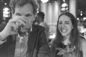 The photograph captures a candid moment between two individuals in a dimly lit bar, emphasizing the contrast of light and shadow. The man, partially obscured by his drink, exudes a sense of mystery, while the woman beside him radiates warmth and joy, creating a dynamic interplay. The soft focus in the background adds to the intimate atmosphere, inviting viewers into their shared experience.