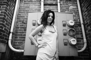 A striking black-and-white portrait of a woman confidently posing against a backdrop of textured, exposed brick and industrial electrical meters. The interplay of light and shadow accentuates her relaxed demeanor, while her casual attire and confident stance convey a sense of strength and individuality. The composition harmonizes urban grit with personal expression, creating an evocative atmosphere.
