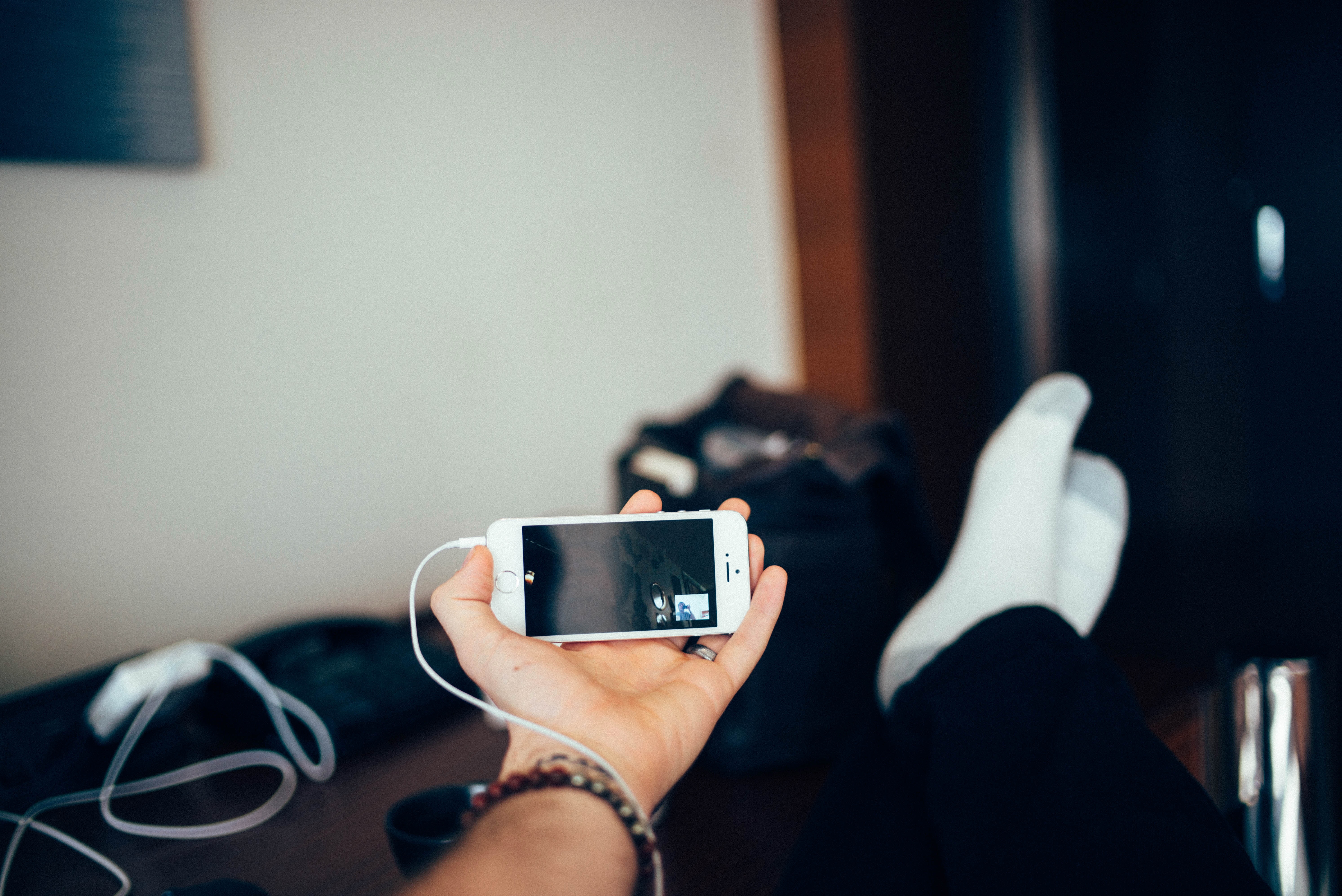 A hand holds a smartphone displaying a video call, hinting at a moment of connection amidst a relaxed setting. The soft, natural lighting evokes a sense of ease and intimacy, while the blurred background suggests a private and personal space. The focus on the phone contrasts with the serene posture of the feet resting nearby, capturing the essence of modern communication.