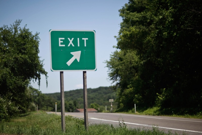 The photograph captures a weathered green exit sign, boldly directing drivers toward an unseen destination. Sunlight floods the scene, accentuating the lush greenery that frames the road and creating a sense of openness and possibility. The sharp angle of the sign’s arrow suggests movement and transition, inviting contemplation on the journeys we choose to take.