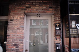 This photograph captures the weathered brick façade of a building, accented by a weathered door marked with the number 39. The soft, muted lighting enhances the sense of nostalgia and history, while a subtle reflection hints at the presence of the photographer, creating a personal connection to the scene.