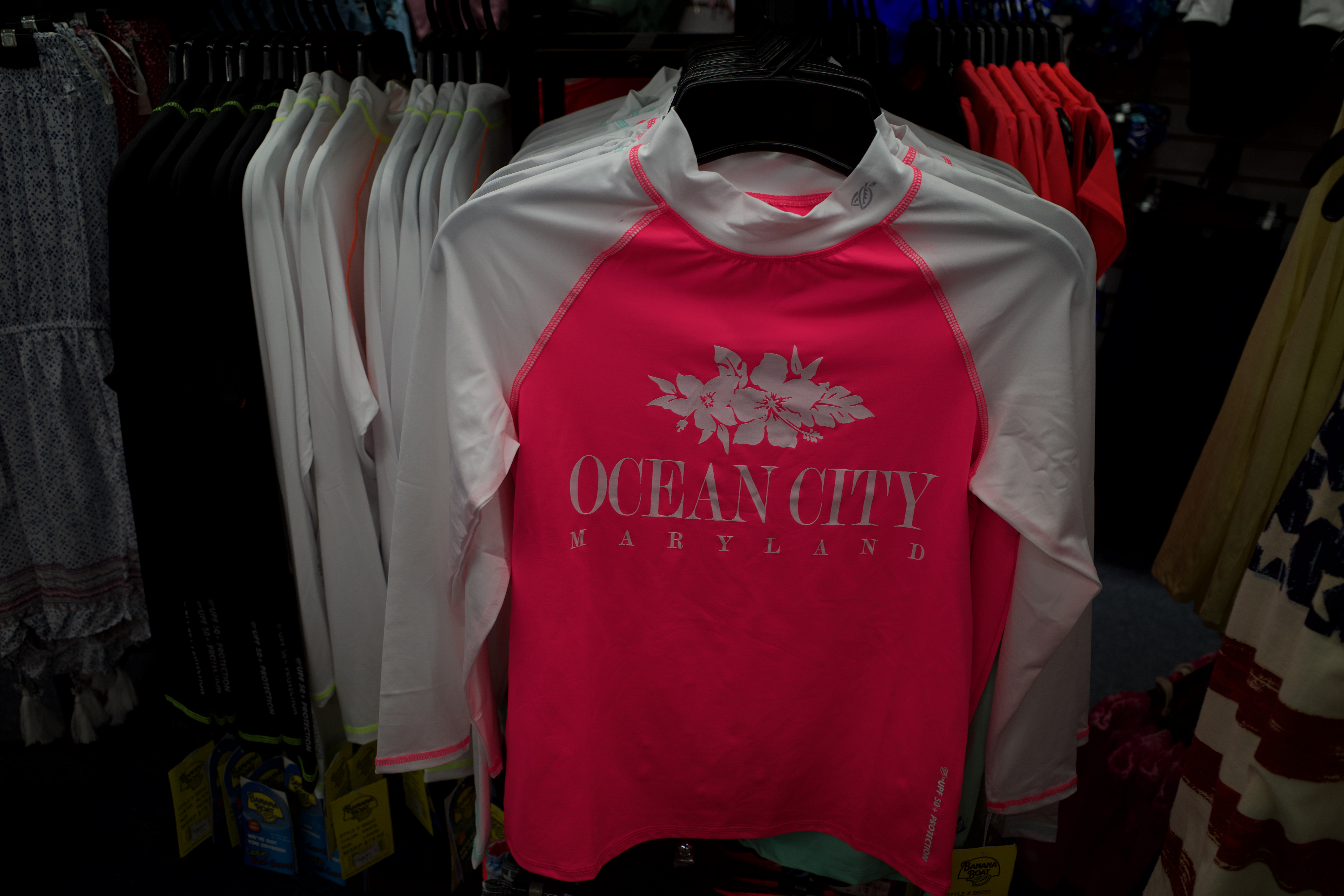 The photograph features a striking pink and white sun protection shirt hanging amongst a colorful array of garments. The bright colors evoke a feeling of summer leisure, while the bold branding connects the piece to a beach destination. Soft lighting enhances the cheerful mood, inviting thoughts of sun-soaked days by the ocean.