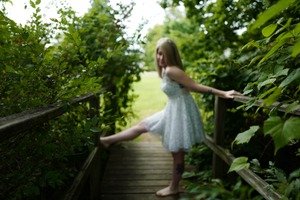 A young woman in a light, floral dress playfully poses on a wooden bridge surrounded by lush greenery. The soft focus lends a dreamy, whimsical quality to the photograph, evoking a sense of innocence and tranquility. Sunlight filters through the leaves, casting a gentle, dappled glow on the scene, enhancing the serene and carefree mood.