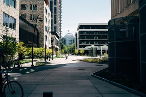 A tranquil urban scene unfolds, showcasing modern architecture flanking a sunlit walkway. The gentle interplay of light and shadows accentuates the greenery, creating a harmonious atmosphere where people casually navigate the space. The composition leads the eye toward the distant dome, inviting a sense of exploration and calm within the city's bustle.