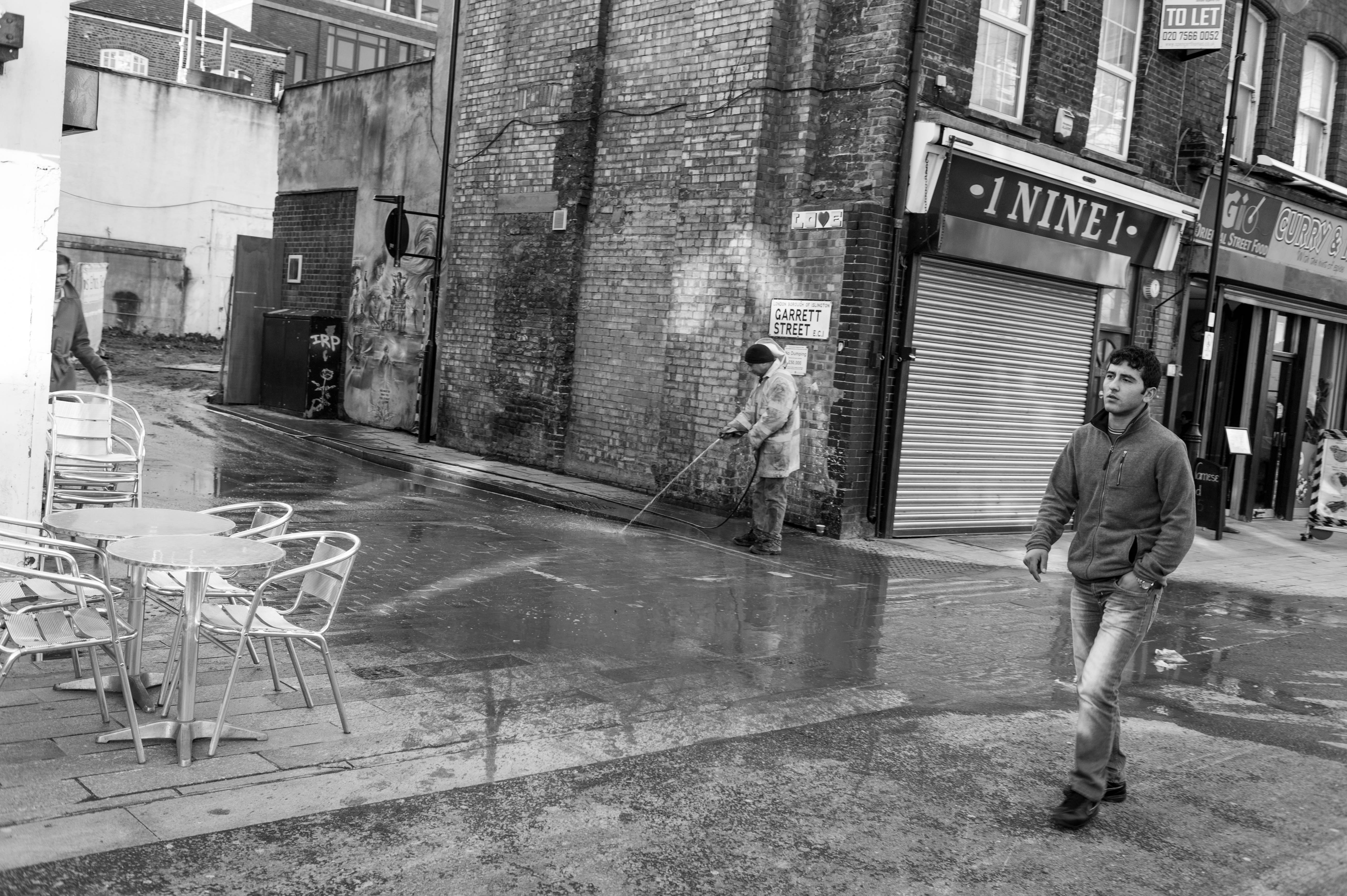 In this monochrome scene, a man walks purposefully through a rain-soaked street while another diligently cleans the pavement nearby. The stark contrast of the wet ground mirrors the gritty urban backdrop, creating a reflective mood. The composition reveals a sense of daily routine amidst the quiet chaos of city life, with the lighting enhancing the somber yet contemplative atmosphere.