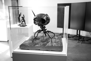 A striking black-and-white photograph captures an intricate sculpture resembling a fusion of anatomical features and mechanical elements. The subject, encased in glass, is dramatically lit, casting shadows that enhance its eerie, otherworldly presence amid a minimalist exhibition space, invoking a sense of curiosity and intrigue.