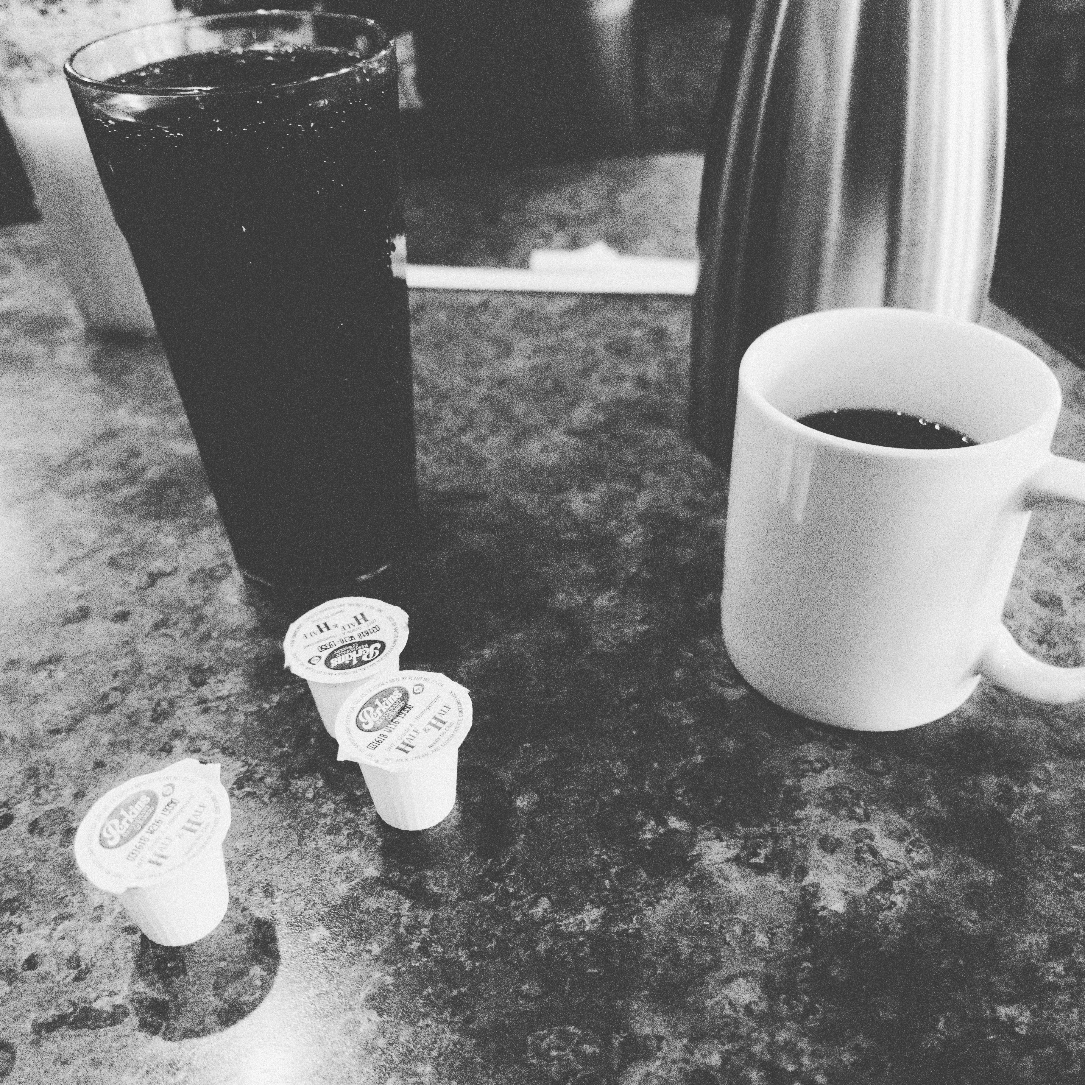 This monochromatic photograph captures a casual coffee shop scene, featuring a glass of dark soda, a steaming cup of coffee, and three small creamers positioned artfully on a textured tabletop. The contrasting tones evoke a sense of nostalgia, while the soft lighting highlights the intimate atmosphere of shared moments over drinks. The composition invites viewers to pause and appreciate the simplicity of everyday indulgences.