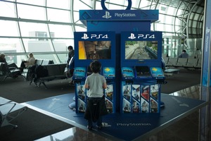 In a bright airport terminal, a young child stands captivated by two PlayStation 4 consoles, their screens glowing with vibrant game visuals. The sleek, modern architecture of the airport contrasts with the child's playful enthusiasm, creating a juxtaposition of the energy of gaming against the backdrop of travel. Soft light filters through the large windows, enhancing the sense of anticipation in this transient space.