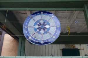 A vibrant circular stained glass piece hangs illuminated in soft light, its intricate blue and clear patterns casting delicate reflections. The surrounding area, adorned with whimsical charms, creates a peaceful and artistic atmosphere that invites contemplation. This composition balances simplicity and elegance, capturing the interplay of light and color.