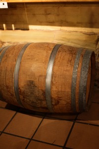 A rustic wooden barrel rests on terracotta tiles, exuding a sense of history and craftsmanship. Warm, gentle lighting casts soft shadows, enhancing the rich textures of the wood and metal bands. This intimate composition evokes nostalgia, inviting viewers to imagine the stories held within and the aged spirits it once contained.