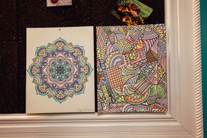 The photograph captures two vibrant artworks mounted on a corkboard backdrop, highlighting a serene mandala on the left and an intricate, abstract design on the right. The contrasting styles lend a dynamic visual interest, while the warm lighting enhances the colors, creating an inviting and creative atmosphere. Framed by a white border, these pieces celebrate the beauty of personal artistic expression.