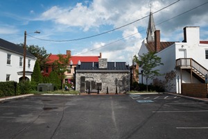 This photograph captures a serene urban scene where a modest stone building stands amidst a sparse parking lot, contrasting with the vibrant hues of nearby structures. The soft, diffused lighting enhances the tranquil mood, while the scattered clouds above add depth to the expansive sky. The composition invites the viewer to reflect on the everyday simplicity and charm of city life.