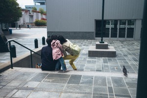 In a subtle urban setting, a family leans closely together, their focus on something captivating just out of view. The composition is marked by soft, natural lighting that enhances the warm tones of their clothing against the cool stone backdrop. A lone pigeon adds a touch of whimsy to the scene, emphasizing a moment of shared curiosity and connection.