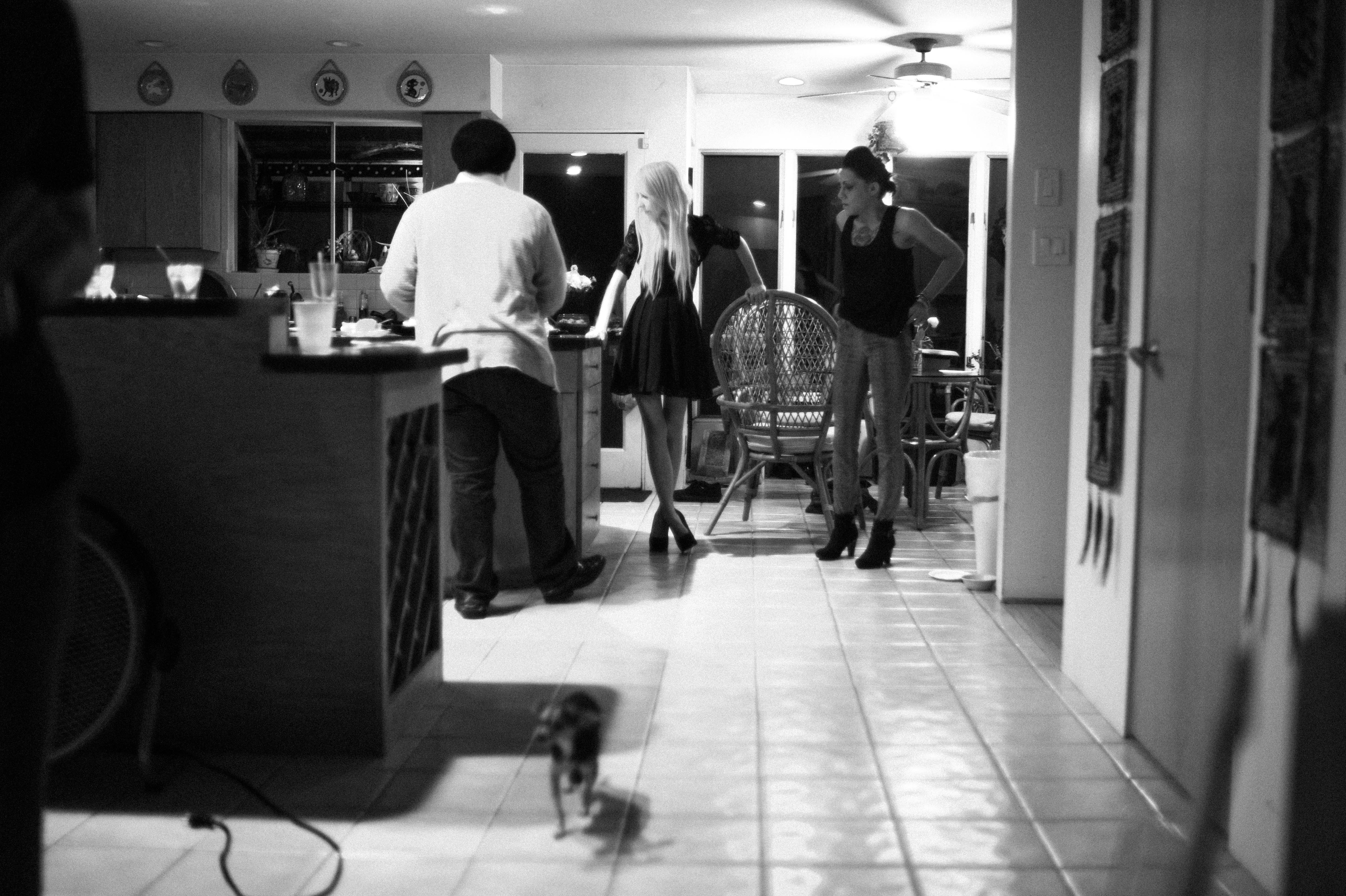 In this candid monochrome capture, a group of friends mingle in a warmly lit kitchen space, creating an intimate yet lively atmosphere. The composition draws the eye down the corridor, where a small dog trots, adding a touch of playfulness to the scene. The soft contrasts of light and shadow enhance the mood, evoking a sense of nostalgia and connection among the subjects.