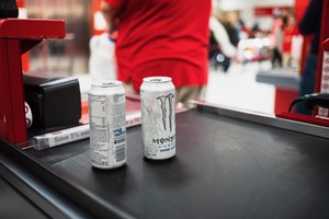 In a busy retail environment, two cans of Monster energy drink rest on a sleek checkout counter, the vivid reds of the surroundings creating a vibrant backdrop. The composition draws attention to the sleek, minimalist cans, while the blurred movement of customers in the background adds a dynamic energy to the scene. Soft, artificial lighting enhances the vibrancy of the colors, creating a sense of urgency and excitement typical of a bustling shopping experience.