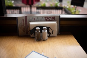 The photograph captures a cozy dining table adorned with salt and pepper shakers, a menu, and a napkin holder featuring an artistic black silhouette. Soft, diffused light filters in through the window, creating a warm and inviting atmosphere, perfect for an intimate meal. The composition highlights the simplicity of the scene, evoking a sense of quiet anticipation for the culinary delights to come.
