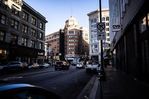 This photograph captures a vibrant city street bustling with vehicles and storefronts, framed by ornate historical buildings that add character to the scene. The soft morning light casts gentle shadows, creating a warm, inviting atmosphere amidst the urban landscape. The composition draws the eye toward the architectural details of the central building, highlighting the mixture of old and new in the city.