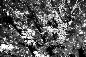 This monochromatic photograph captures the intricate interplay of light and shadow among the branches of a maple tree. The stark contrast highlights the delicate texture of the leaves, creating a serene and contemplative mood. A sense of quiet beauty permeates the composition, evoking the stillness of a chilly winter afternoon.