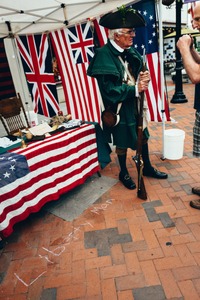A solemn, elderly man in historical attire stands guard, embodying the essence of past struggles for liberty. Strikingly illuminated by soft, diffused light, his presence is framed by vibrant flags, creating a vivid contrast against the cobblestone ground. The atmosphere blends a sense of nostalgia with the liveliness of the surrounding market, inviting passersby to engage with history.