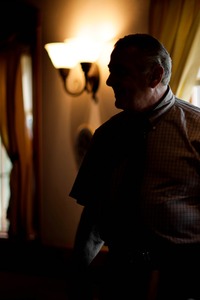 A gentleman stands in profile, his silhouette sharply defined against a backdrop of soft golden light. The rich interplay of shadows and illumination creates an intimate, nostalgic mood, inviting reflection. Draped curtains and wall sconces add a touch of warmth, enhancing the atmosphere of quiet contemplation.