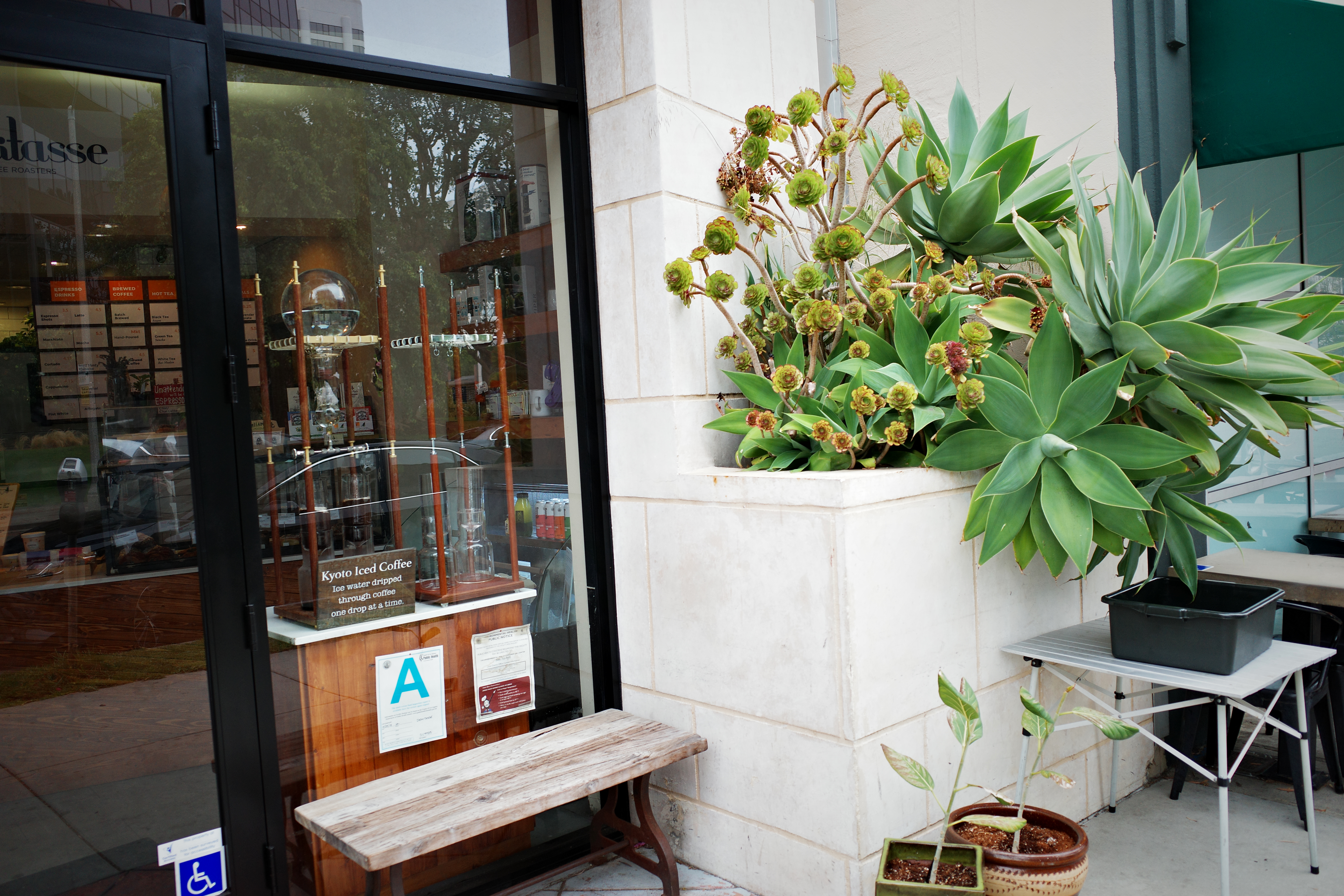 The photograph depicts a cozy café entrance framed by lush, vibrant greenery. The inviting wooden bench adds a touch of warmth, while the soft, diffused lighting creates a calm and welcoming atmosphere. The contrast between the modern storefront and the natural elements evokes a harmonious blend of urban life and nature.