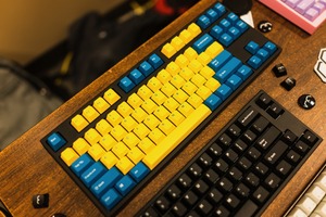 The photograph showcases two keyboards symmetrically arranged on a wooden desk, with one prominently featuring vibrant yellow and blue keys that evoke a playful energy. The lighting is warm and inviting, highlighting the unique design and craftsmanship of the keyboards. In the background, subtle shadows and hints of other accessories suggest a creative workspace filled with character.