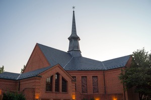 This striking photograph captures a modern church with a towering spire, silhouetted against a soft twilight sky. The warm glow of lights around the building creates an inviting atmosphere, contrasting with the cool hues of dusk. Angular lines and brick textures add a sense of strength and serenity, evoking a mood of contemplation and peace.