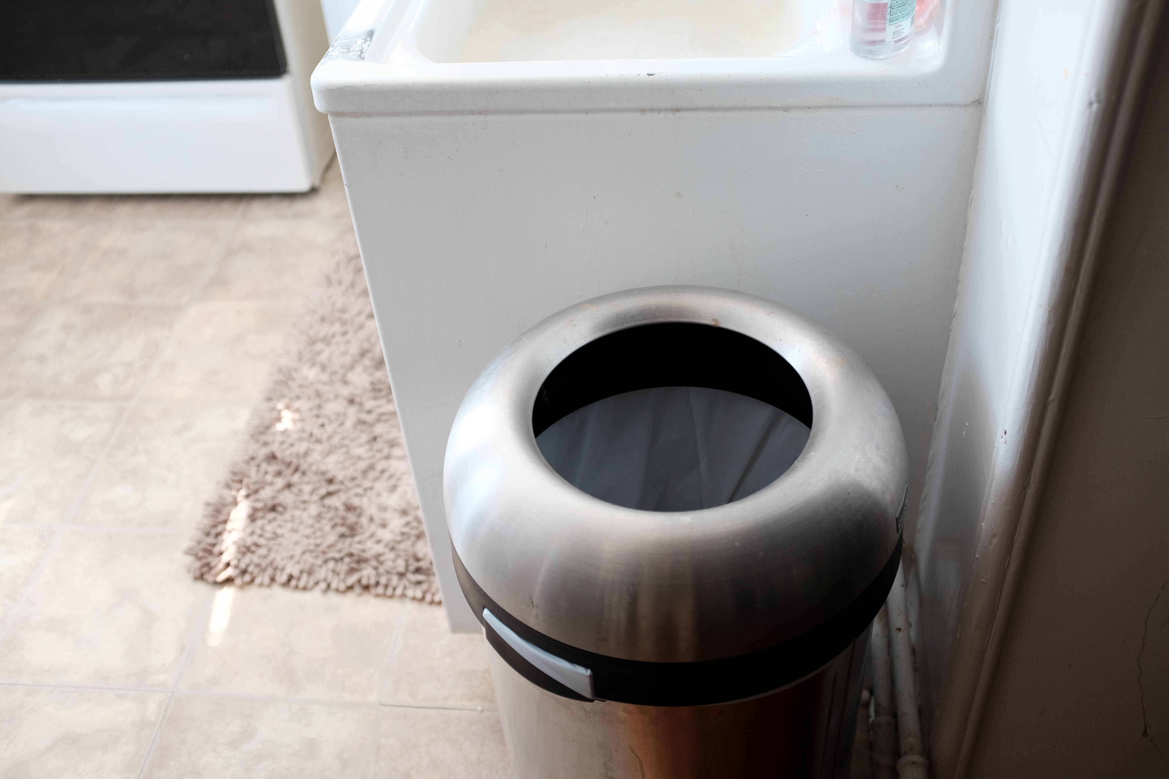 The photograph captures a clean, modern trash can set against a softly lit kitchen backdrop, conveying a sense of understated order. The metallic finish of the trash can contrasts with the warm tones of the tiled floor and the soft texture of the rug nearby. Overall, the composition evokes a serene yet functional atmosphere, highlighting the balance between daily necessity and aesthetic simplicity.