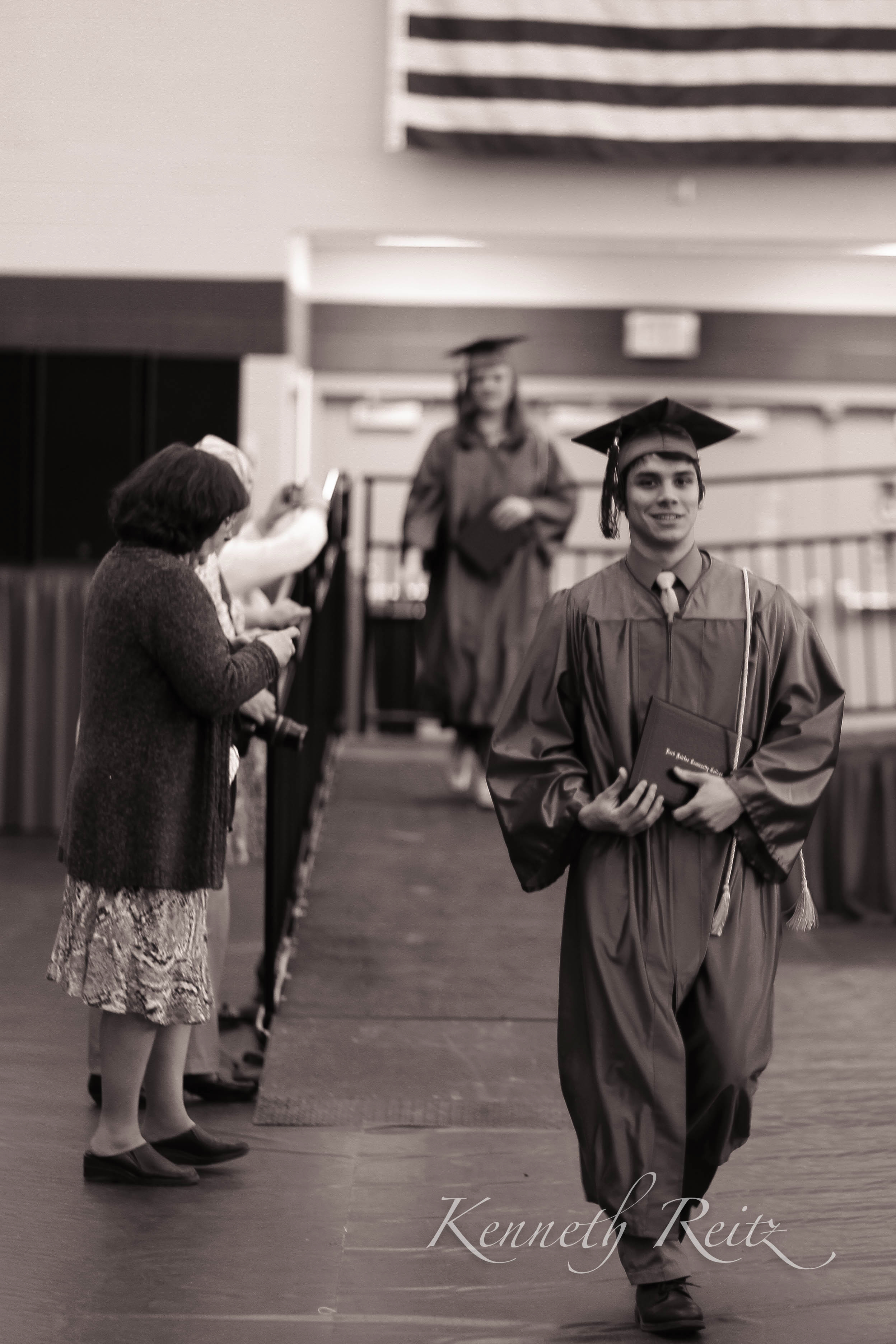 A jubilant graduate strides confidently across the stage, clutching their diploma with pride amid a backdrop of excited onlookers. The sepia tone evokes nostalgia, while the intimate setting captures the emotional gravity of this milestone moment. The composition highlights both the graduate's determination and the supportive presence of family in the crowd, creating a warm and celebratory atmosphere.