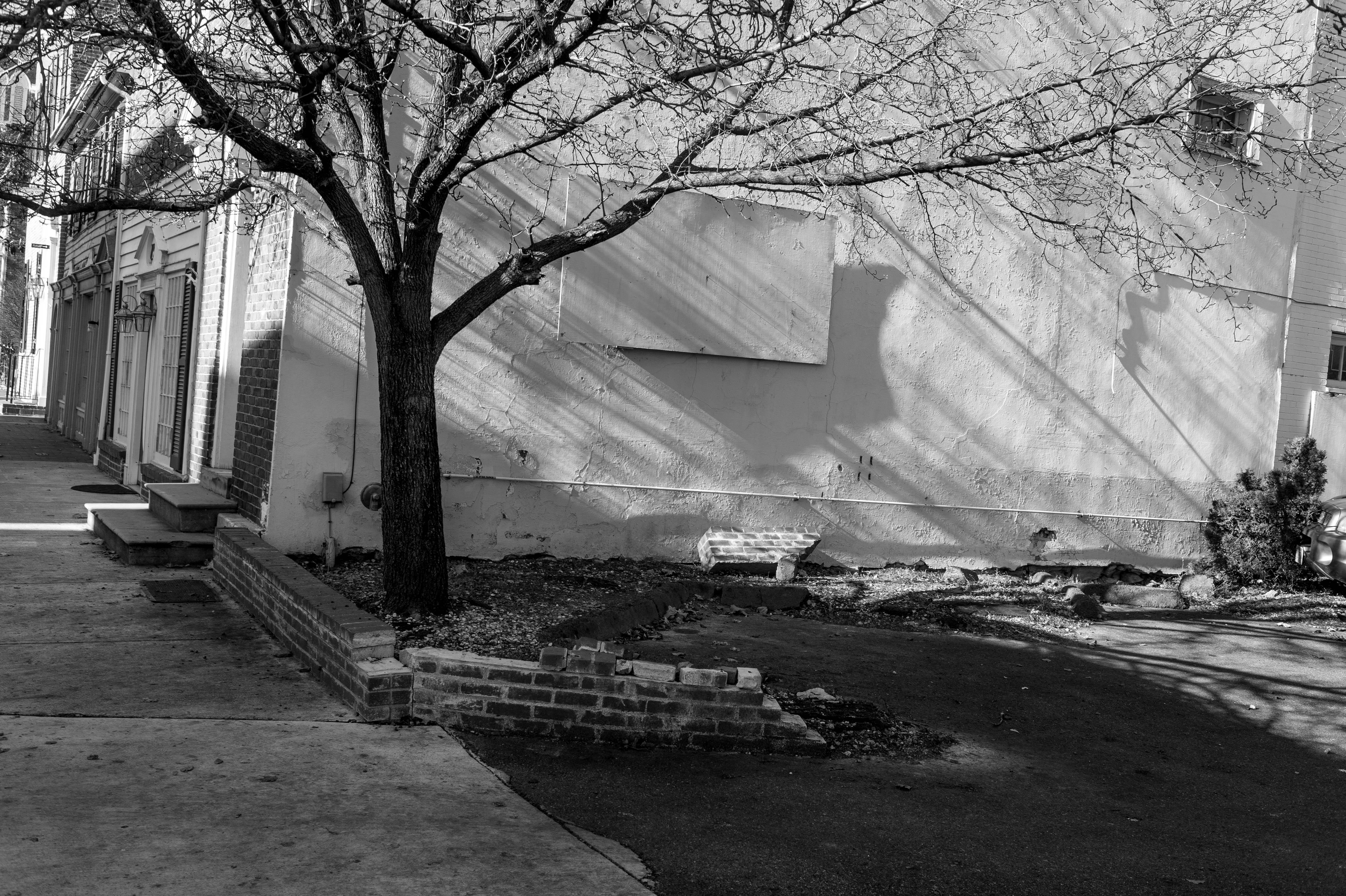 In this monochromatic photograph, a leafless tree casts intricate shadows against a textured white wall, creating a contrast between light and dark. The composition draws the eye along the pathway, leading to a quietly abandoned corner, evoking a sense of stillness and introspection. The interplay of light highlights the weathered surfaces, enhancing the mood of solitude in an otherwise forgotten space.