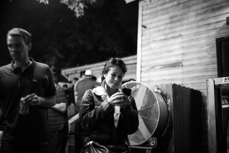 In a dimly lit outdoor setting, a woman focused on her phone captures a moment of solitude amidst the bustling crowd. The contrast of lighting accentuates her thoughtful expression, while the blurred figure beside her adds to the dynamic of nightlife. The composition evokes a sense of intimacy and contemplation against a backdrop of social energy.