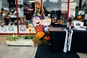 This photograph captures a charming storefront adorned with vibrant autumn decorations and cheerful cutouts of cartoon characters. The warm colors and playful mood create a sense of nostalgia, inviting passersby to engage with the festive atmosphere. Soft natural lighting enhances the colors, giving the scene a cozy, inviting feel.