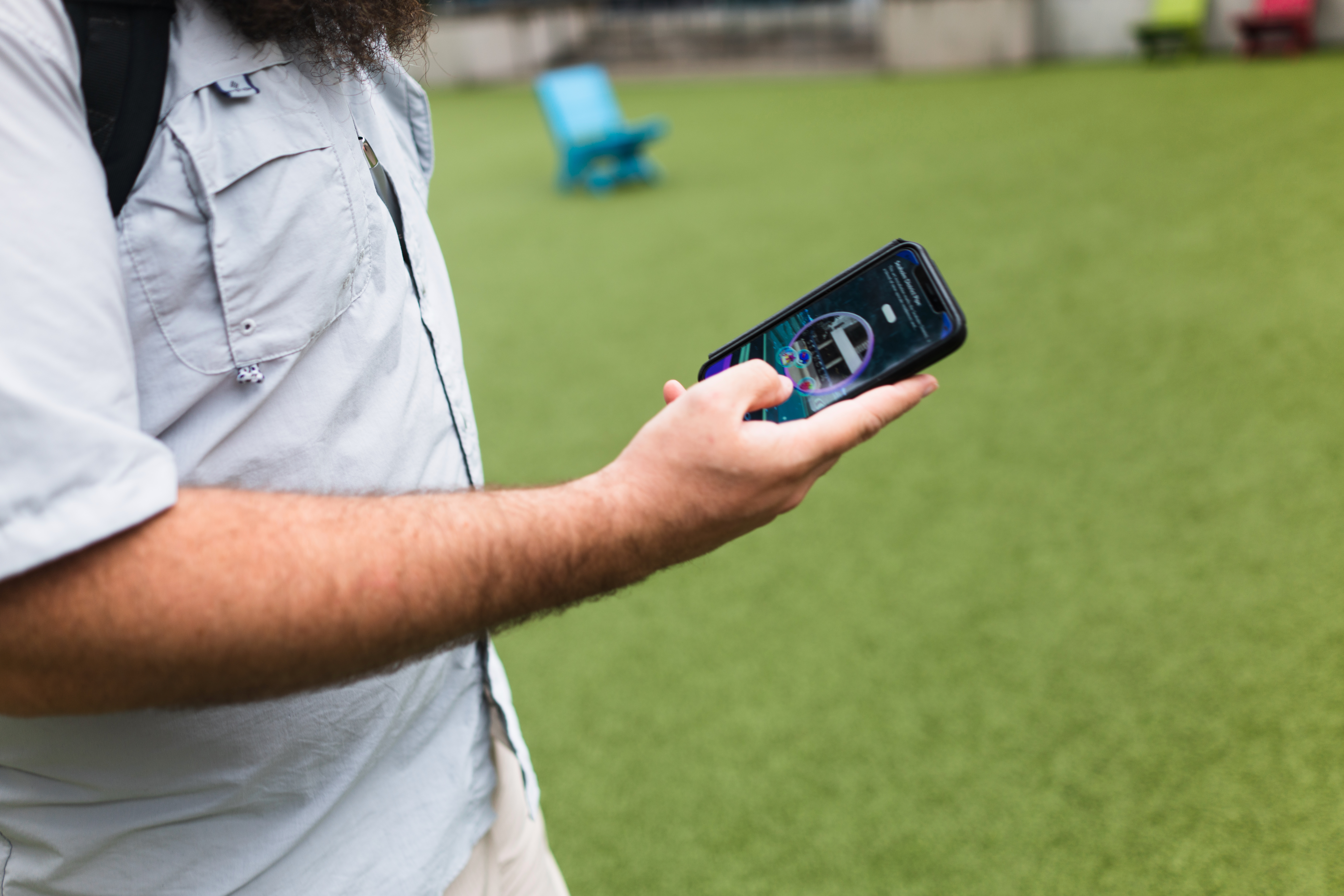 A person stands on vibrant green artificial grass, their attention focused on the smartphone in their hand. The ambient brightness of the surroundings contrasts with the intimate moment of digital engagement, evoking a mood of curiosity and modern connectivity. The composition highlights both the individual and the colorful chairs in the background, creating a playful yet reflective atmosphere.