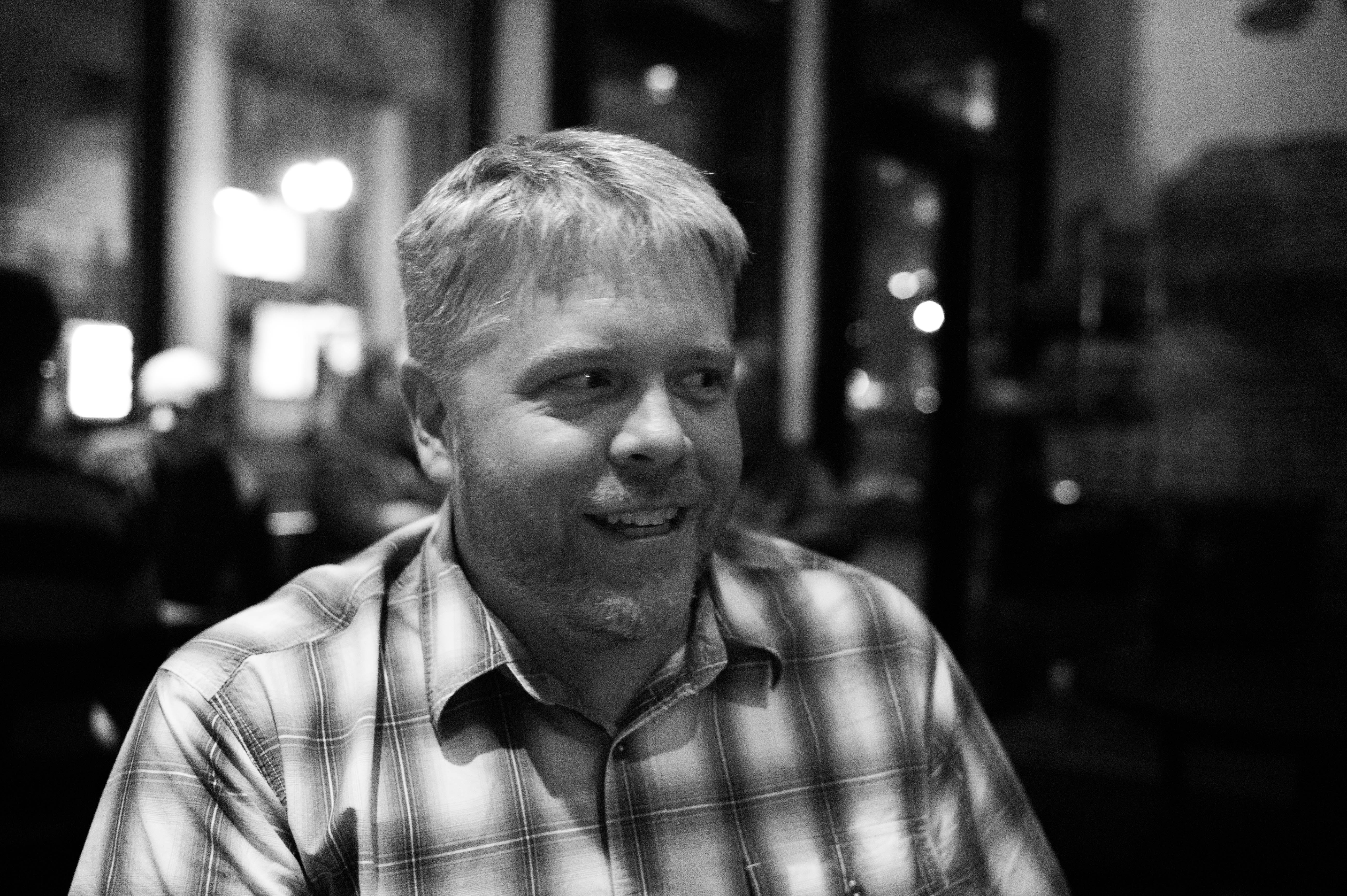 In a cozy, dimly lit café, a man with a friendly smile is captured mid-laughter, embodying a lighthearted moment. The warm glow from the surrounding lights casts gentle shadows, enhancing the intimate atmosphere. The black-and-white composition adds a timeless quality, focusing the viewer's attention on his expressive features amidst a backdrop of blurred patrons.
