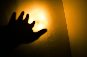 A stark silhouette of a hand reaches towards a glowing fixture, casting deep shadows against a textured wall. The warm, golden light creates a mood of longing or curiosity, evoking a sense of mystery. The composition highlights the contrast between light and dark, inviting contemplation about what lies beyond the grasp of the hand.