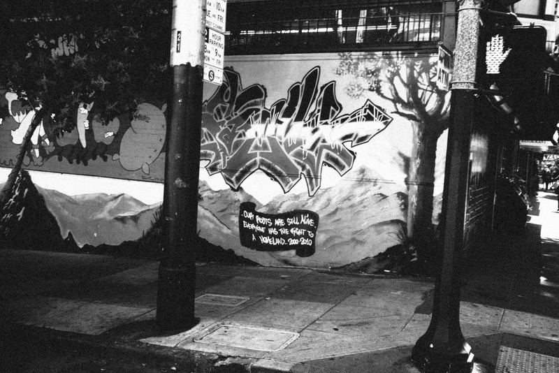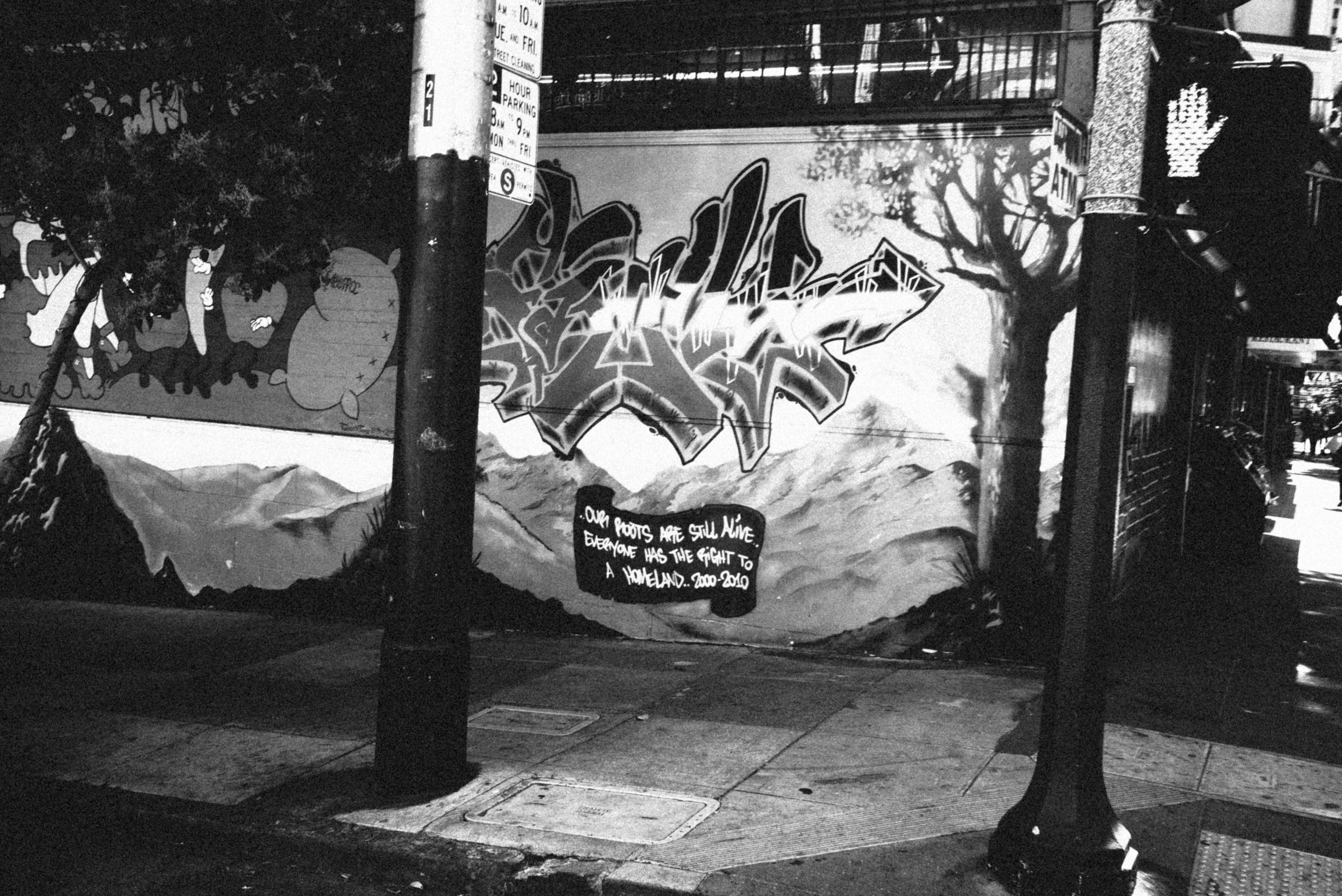 This striking black and white photograph captures a vibrant mural adorned with bold graffiti, prominently featuring a poignant message about roots and belonging. The composition is framed by the stark contrasts of urban elements, with a pole and signs adding depth while casting shadows, creating a mood of reflection amidst the liveliness of street art. The play of light and shadow enhances the emotional weight of the mural, inviting viewers to contemplate its underlying themes.