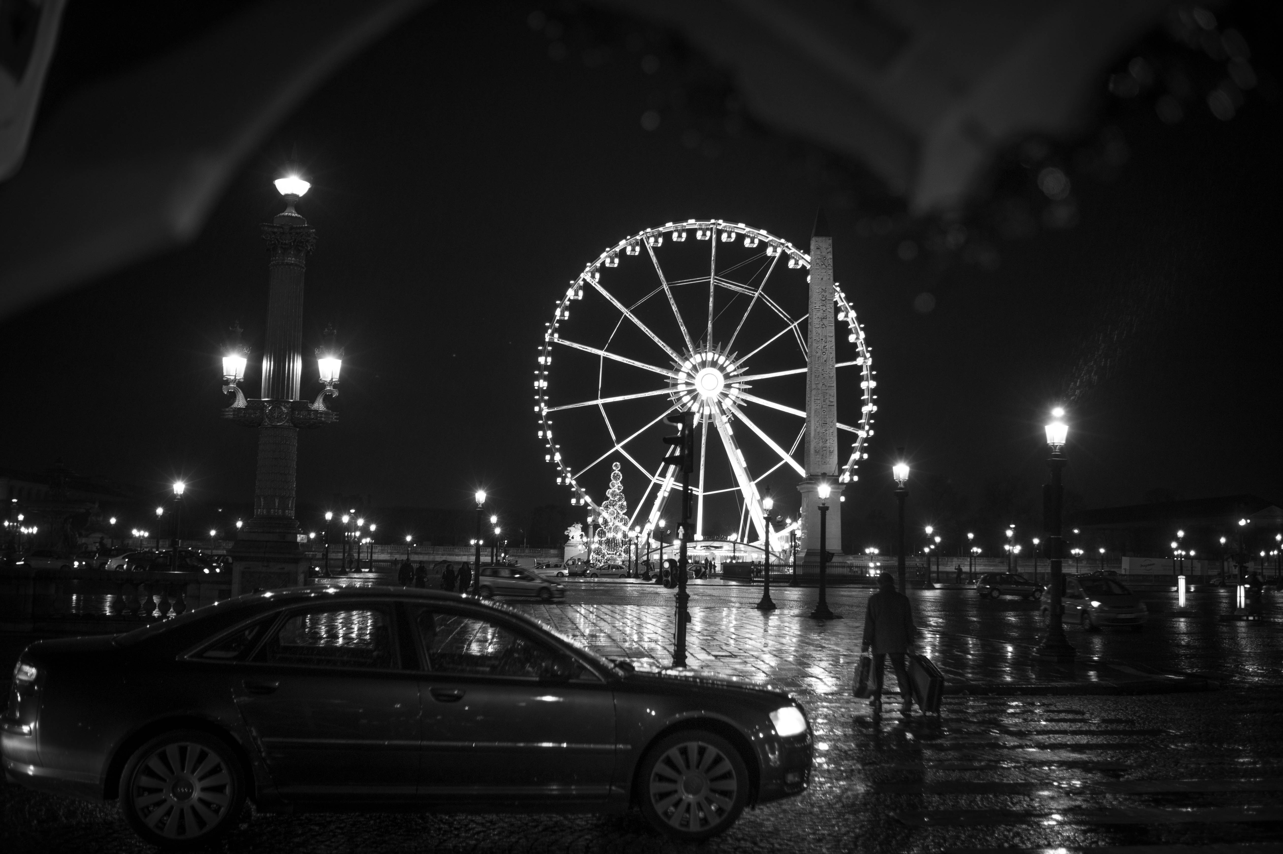 A hauntingly beautiful black-and-white image captures a Ferris wheel illuminated against the night sky, while rain-soaked pavement reflects the glow of streetlights. In the foreground, a car adds to the urban vibe, and a lone figure carries luggage, suggesting a mood of solitude amidst the vibrant city life. The composition draws the eye towards the Ferris wheel, creating a sense of wonder and nostalgia.