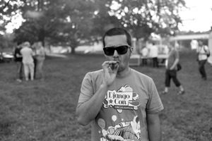In a desaturated landscape, a man stands confidently with a cigar between his fingers, exuding a relaxed, carefree demeanor. His stylish sunglasses and vibrant shirt contrast sharply with the muted background, where blurred figures suggest camaraderie in the distance. The soft, diffused lighting lends an atmospheric quality, enhancing the laid-back, inviting mood of the scene.