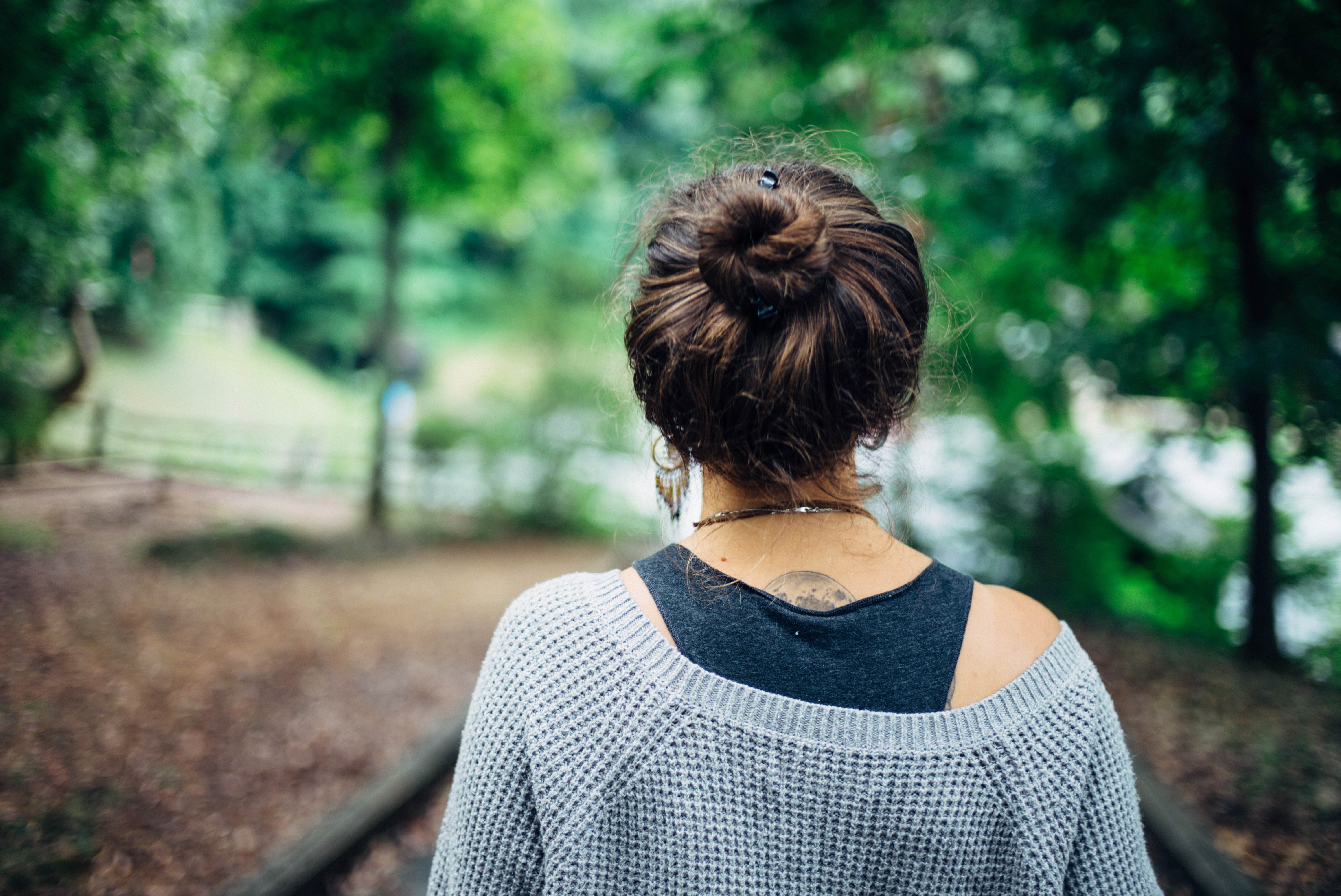 The photograph captures a woman seen from behind, walking along a wooded path. Bathed in soft, dappled sunlight, the serene atmosphere is highlighted by lush greenery and earthy tones, evoking a sense of contemplation and peace. Her casual attire and relaxed posture suggest a moment of quiet reflection amid the beauty of nature.