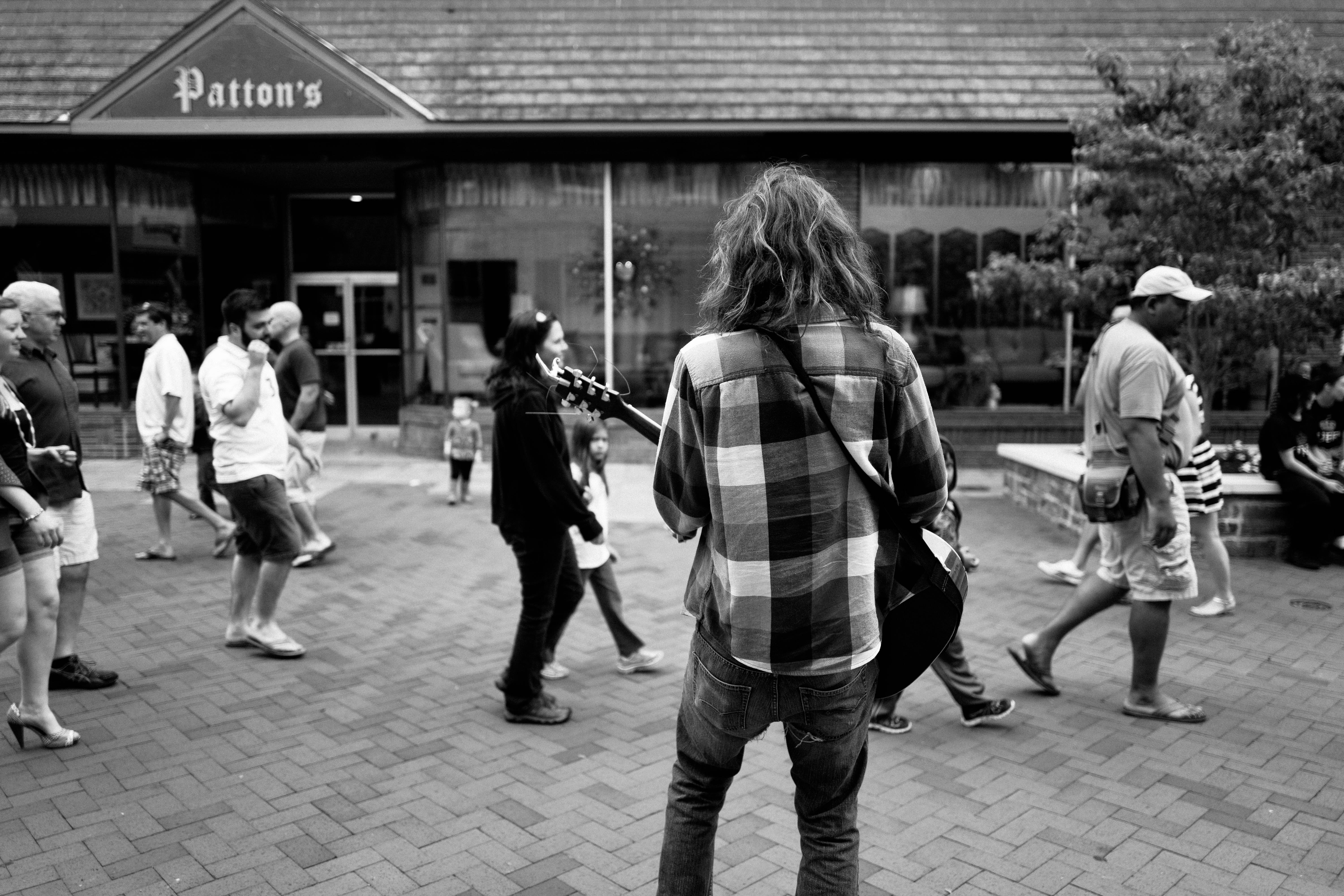 In this monochrome photograph, a lone musician stands with his guitar, facing away from the viewer, blending into a bustling scene of pedestrians. The contrast between his stillness and the lively movement of the crowd creates a poignant moment, evoking a sense of solitude amidst the chaos. Soft lighting highlights the textures of the musician’s plaid shirt, while the lively expressions of those passing by add to the vibrant atmosphere.